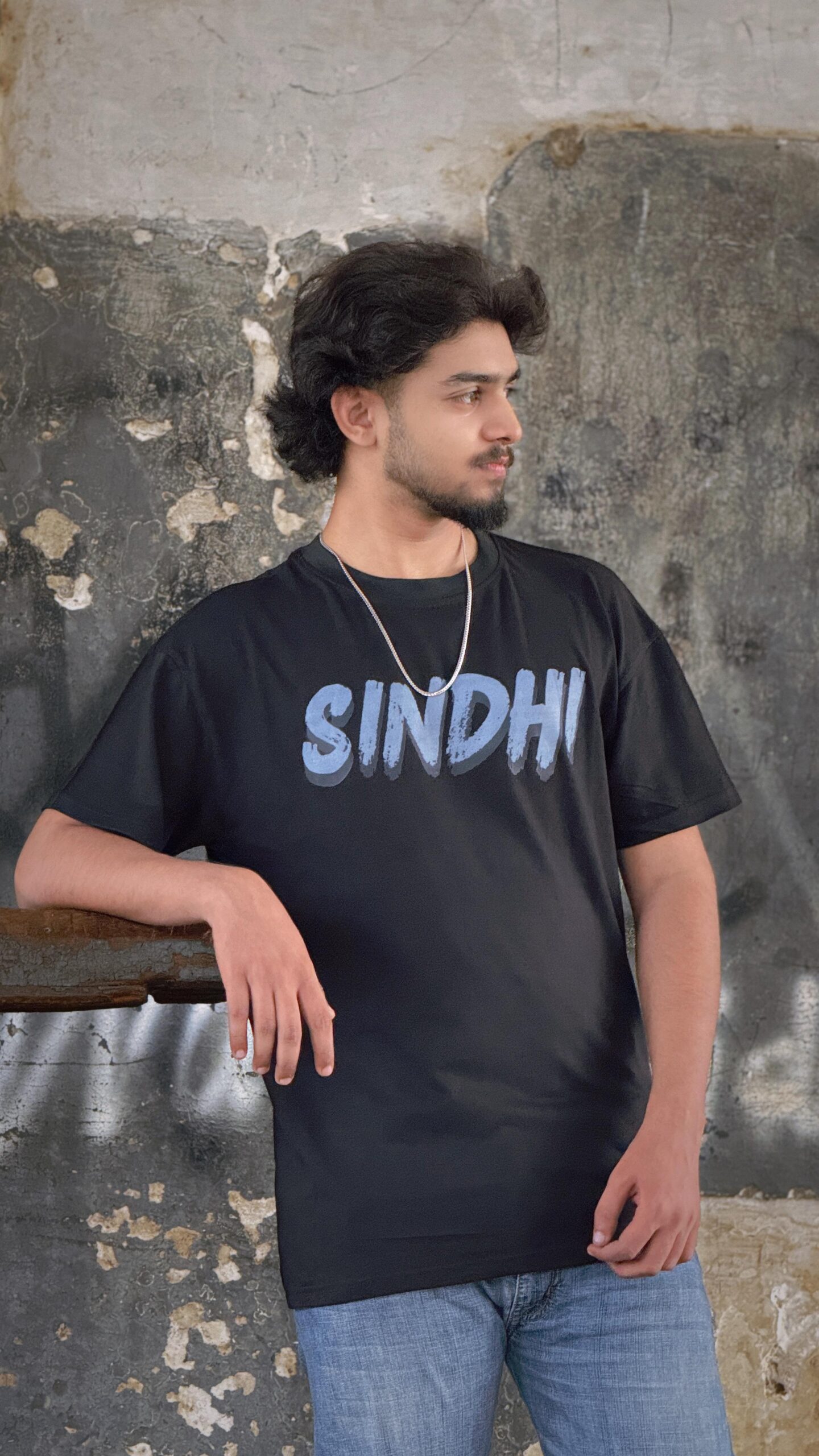 Sindhi Ajrak Back‑Graphic T‑Shirt – Black Unisex Crewneck, “SINDHI” Front Typo Print