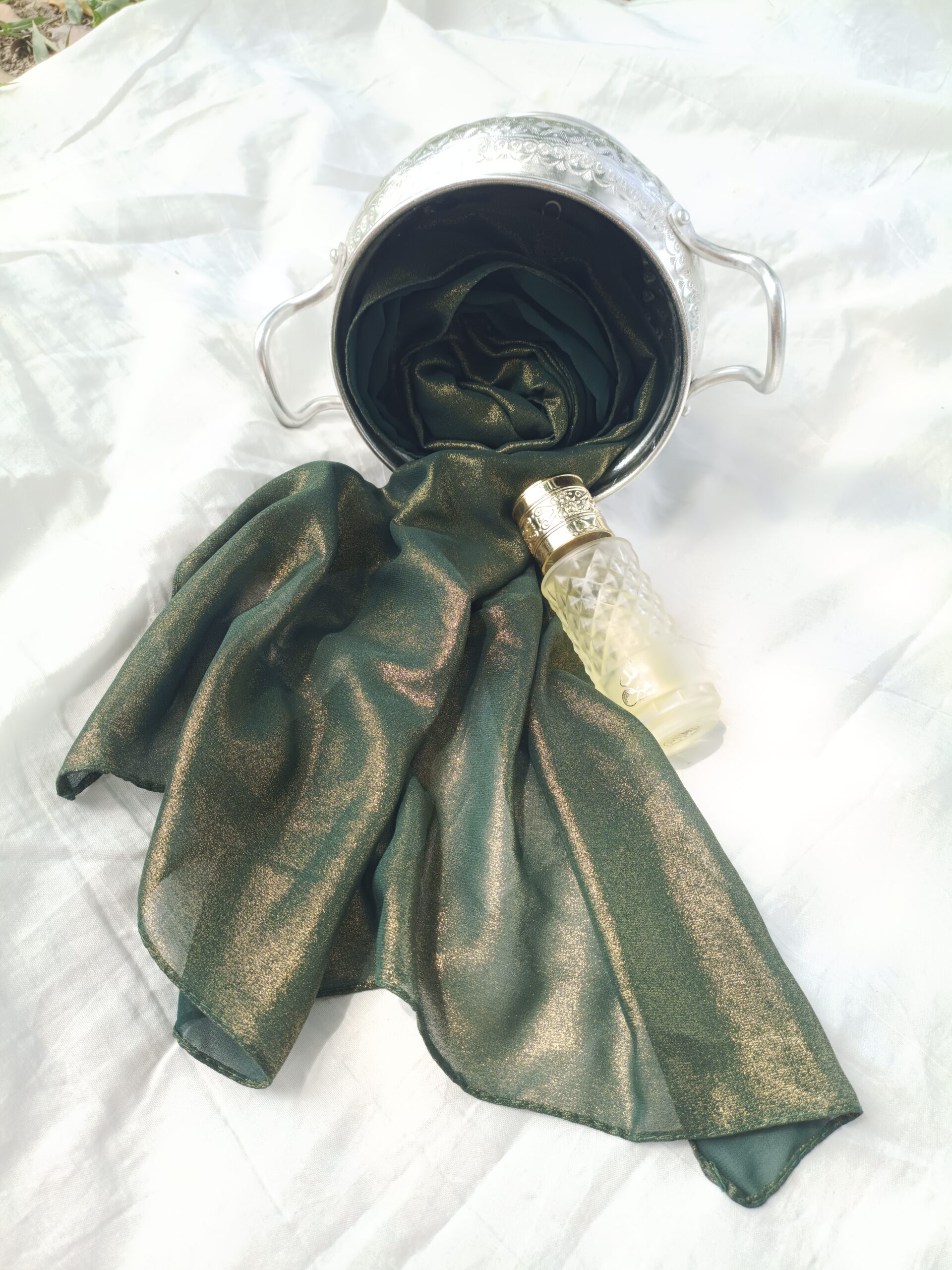 Introducing the Deep Forest Gold Shimmer Hijab, crafted in a lush deep forest green shade finished with an exquisite gold shimmer. This elegant hijab combines modern glamour and classic sophistication—perfect for weddings, parties, and special events, with a breathable, graceful fabric for all-day comfort and style.