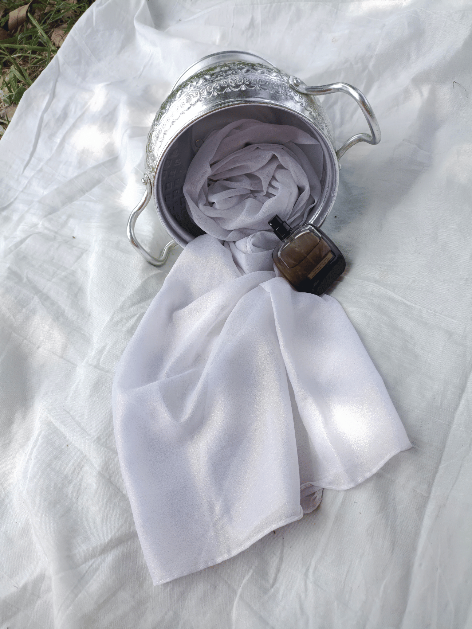 Props featured in the photographs—such as the ornate vessel and perfume bottle—are for aesthetic presentation only; the product for sale is exclusively the described hijab.